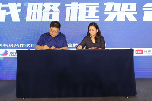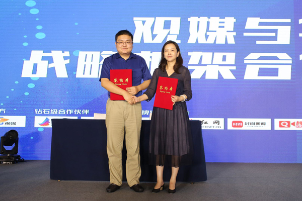 2019年8月8日早上9点,第五届观媒峰会开幕式在四川省成都市举行。图为此次开幕式上,观媒与华龙网战略框架合作签约仪式。重庆华龙网党委书记、董事长李春燕与观媒公司创始人、总裁薛陈子先生签署合作协议。