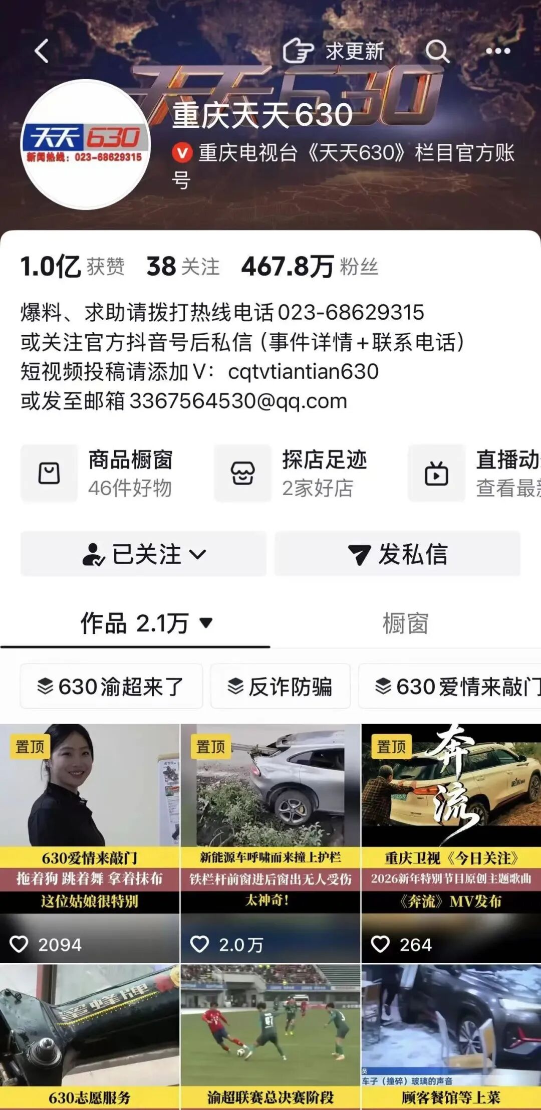 渠道转型,打造全网传播矩阵,是《天天630》改革的第一步。2017年,栏目率先入驻集团第1眼客户端,逐步开通抖音、微博、微信公众号等第三方平台账号,实现自有平台与外部平台的全面覆盖。凭借关注民生、贴近生活的原创短视频内容,栏目账号迅速圈粉,抖音号更是跻身全国广电媒体同类账号前列。截至2026年2月初,其抖音账号累计粉丝460多万,获赞1.0亿次,《凡人微光温暖你我》等四大核心合集播放量均破亿,2025年更在字节跳动全国153个媒体抖音号排名中位居第二,成功实现从“荧屏”到“端号”的传播延伸。