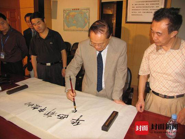 2004年9月21日晚,金庸受邀夜访《华西都市报》 ,在听取了发展情况介绍后,报社领导请金庸题字。