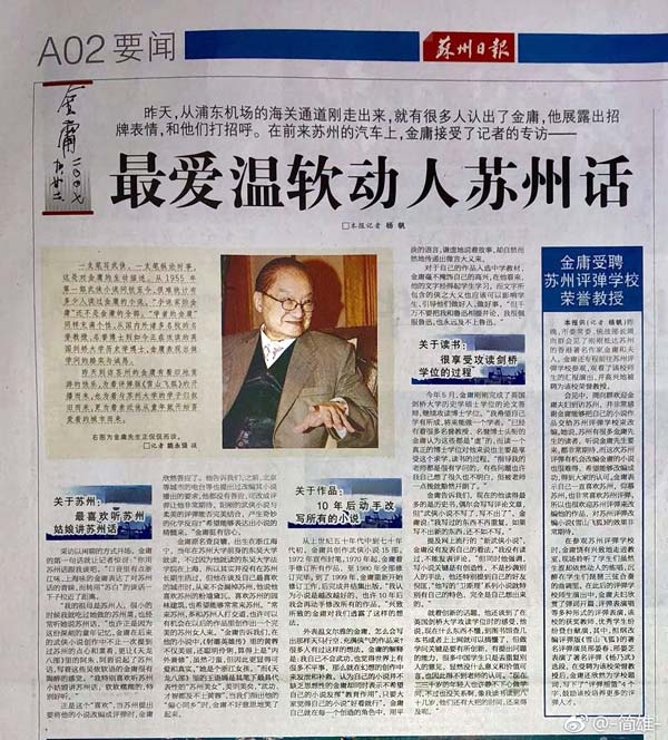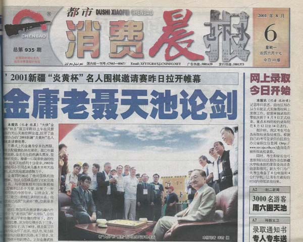 2001年8月6日,新疆《都市消费晨报》头版头条报道金庸。