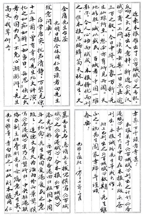 2007年,《光明日报》手书约请金庸为该报撰文。